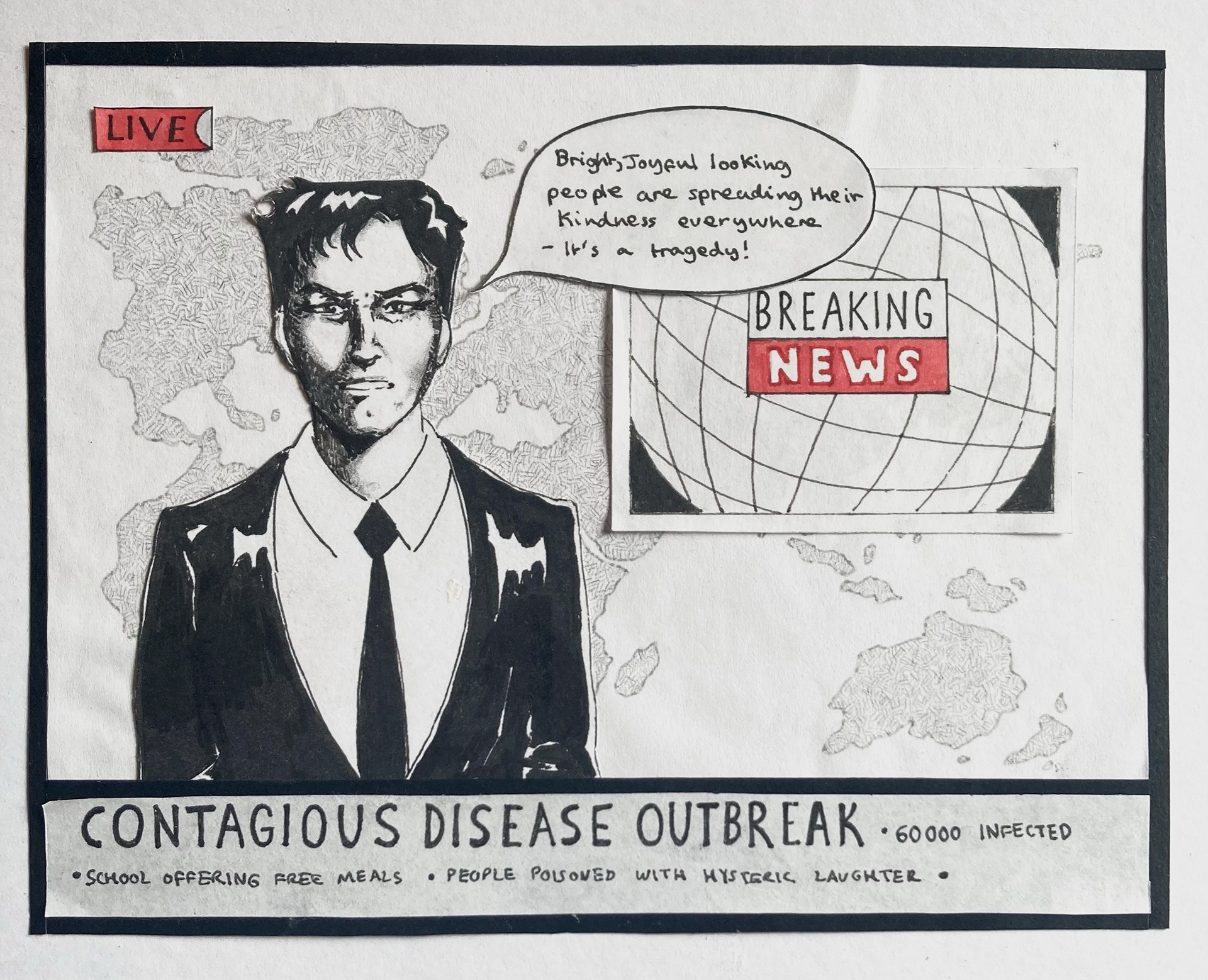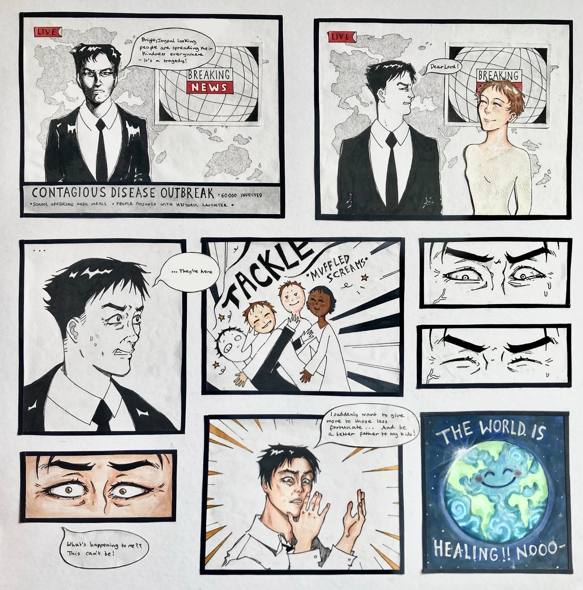 I transformed a segment from a TED talk about the contagious nature of good deeds into a light-hearted and humorous comic. Using ink, pencil, and coloured markers, I visually depicted the speaker's insights on spreading positivity in a cynical world.