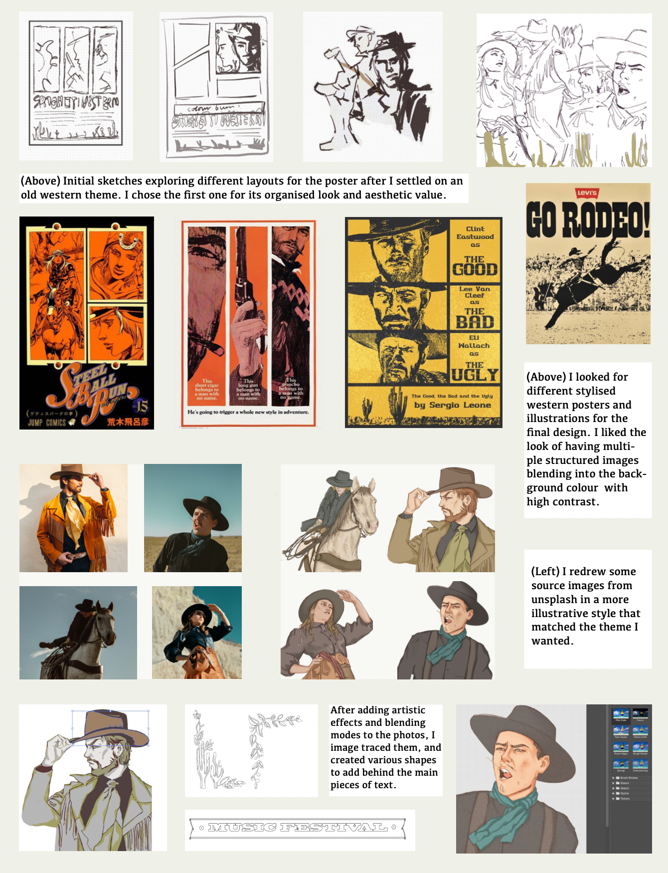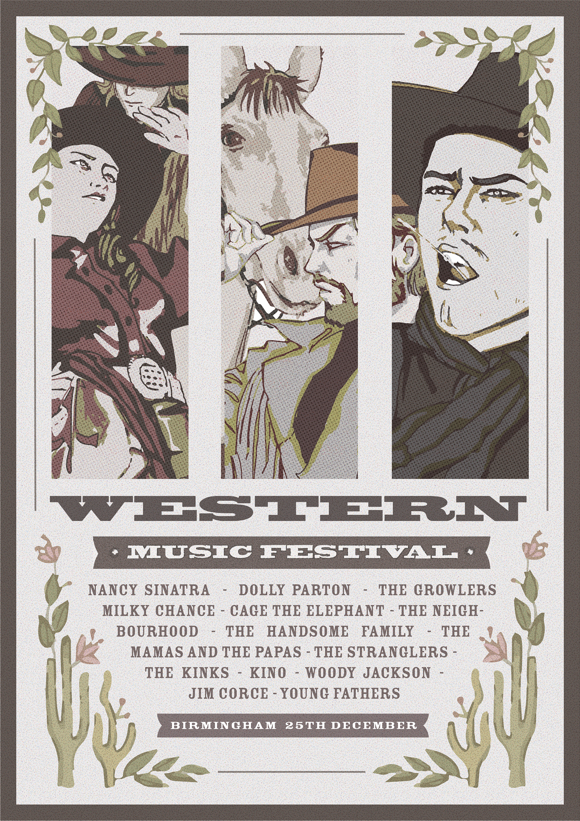 For this Western-inspired poster, Procreate was used for the initial illustrations, followed by Illustrator, Photoshop, and InDesign for refinement.