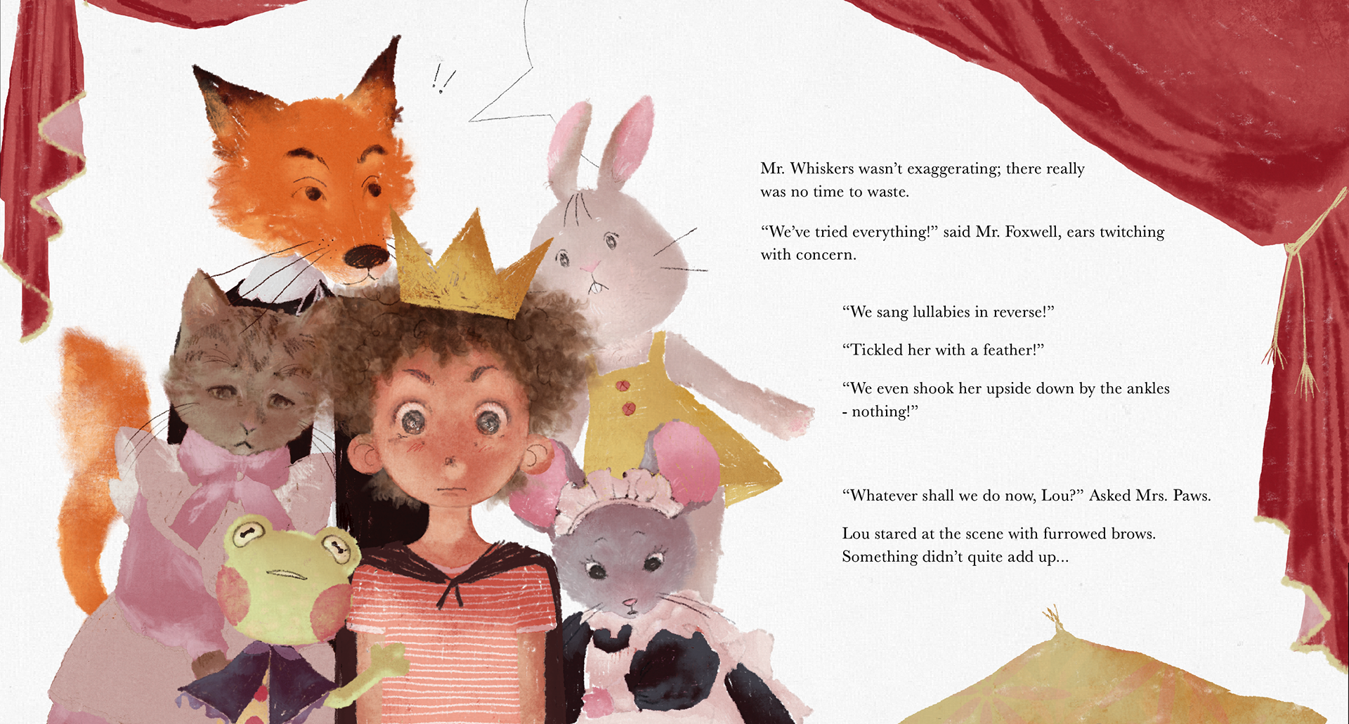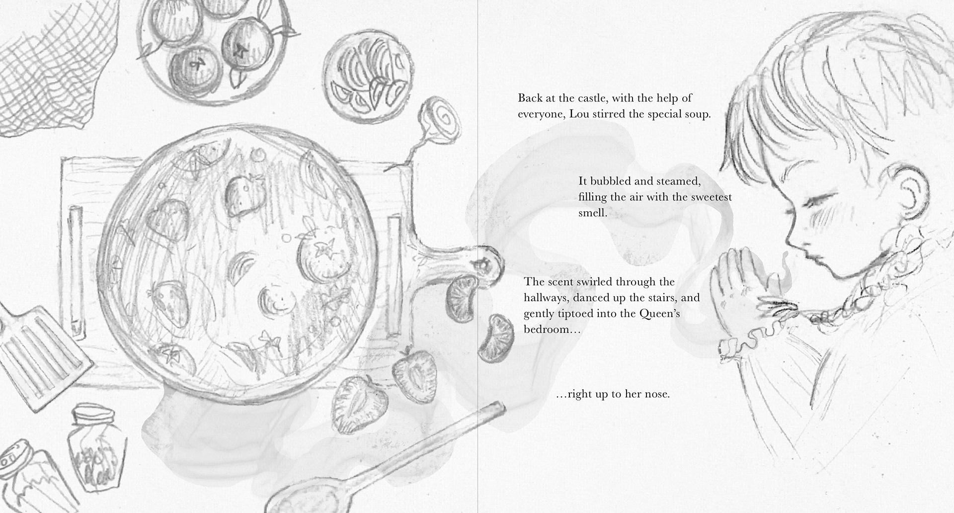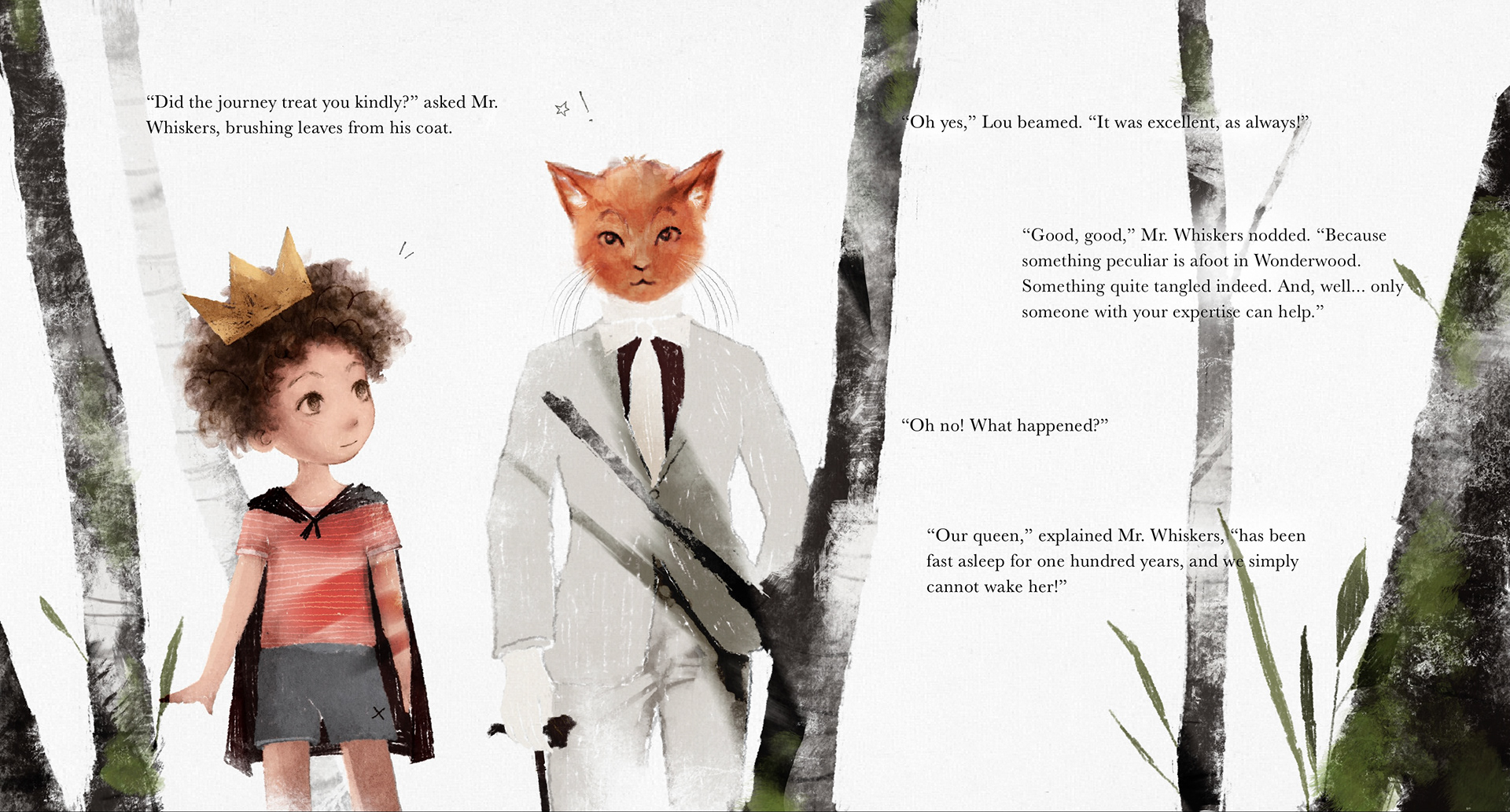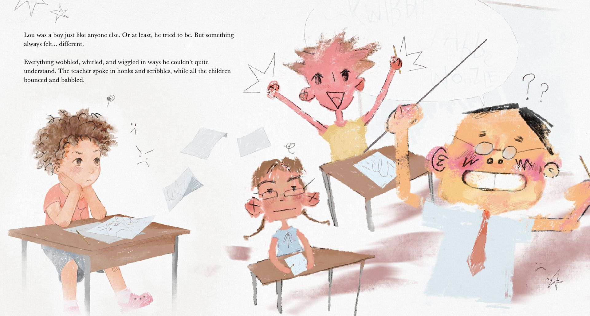 I developed a personal illustrative style with a touch of whimsy, using it to reinforce the story’s meaning. For example, when the main character is in the real world, everything and everyone appears scribbled, nonsensical, and slightly frustrating, as if drawn by the character themself.